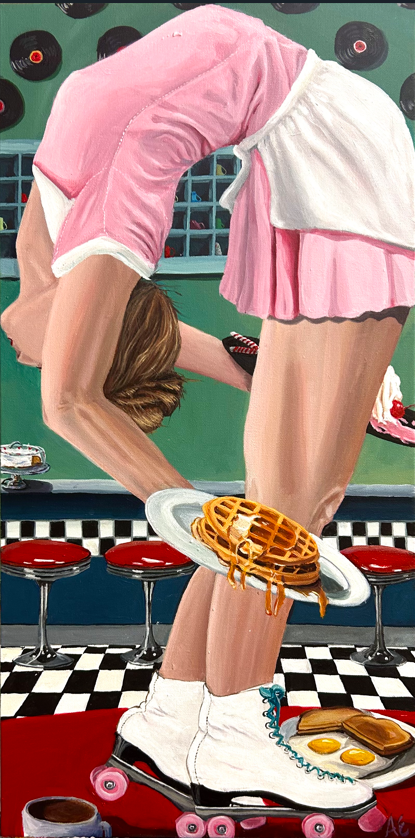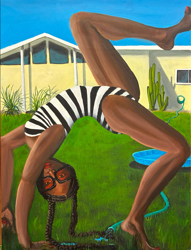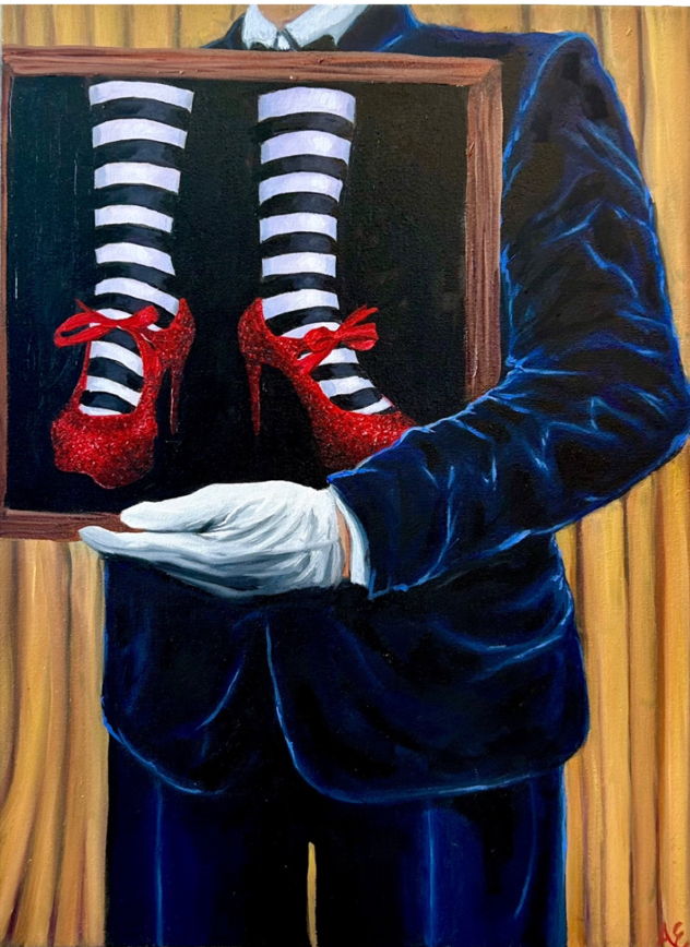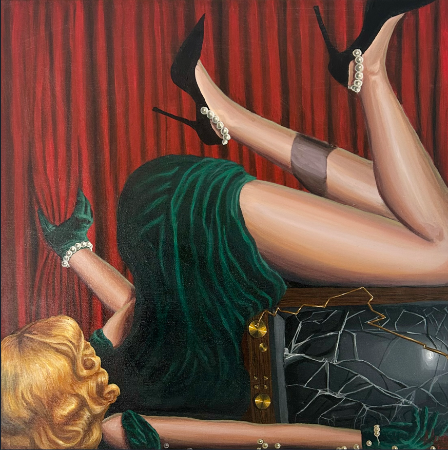 Growing up painting, I was taught to avoid placing a subject right against the edge of a canvas—a rule I deliberately break here. This choice creates tension, mirroring the unease of societal confines. The staged backgrounds reflect how women are perpetually performing, expected to appear flawless and composed under constant scrutiny. Through this interplay of defiance and performance, the collection critiques and reimagines the expectations women face every day. The backgrounds draw inspiration from the aesthetic richness of California, paired with the shimmering allure of American luxury fashion to embody both a symbol of aspiration and cultural ideals.